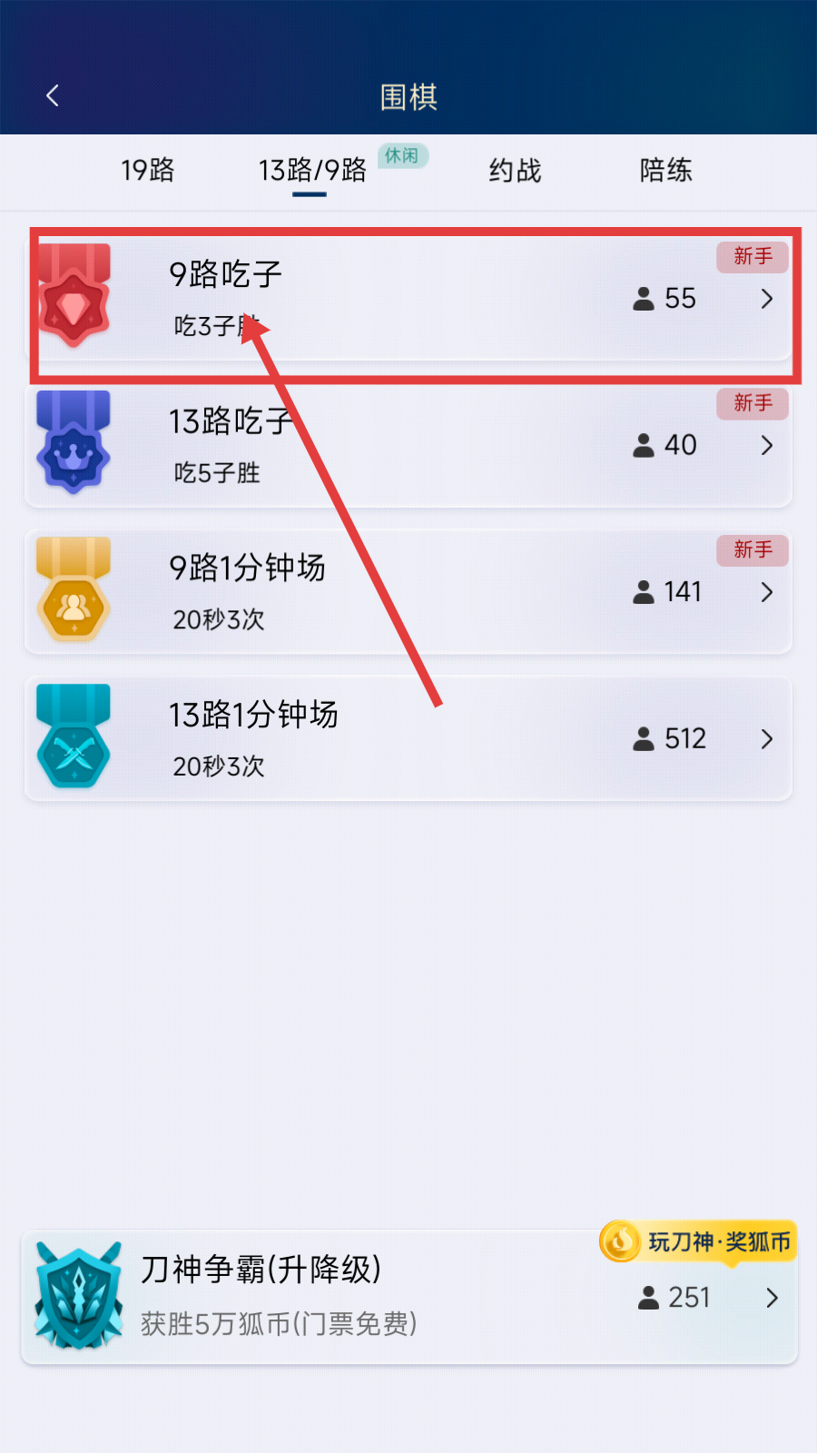 1、进入围棋界面后,选择【9路吃子】新手关卡,该关卡目标为吃3子胜,可开启对局练习吃子技巧。