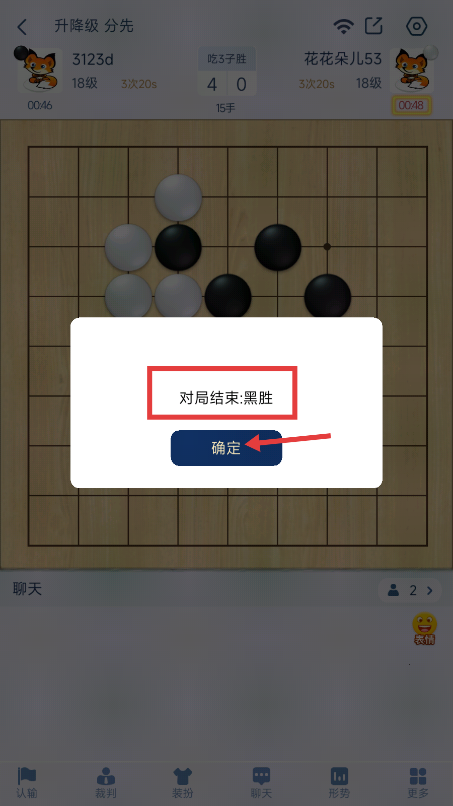 4、对局结束后,若出现【对局结束:黑胜】提示,点击【确定】结算,可总结本局策略,为后续对局积累经验。