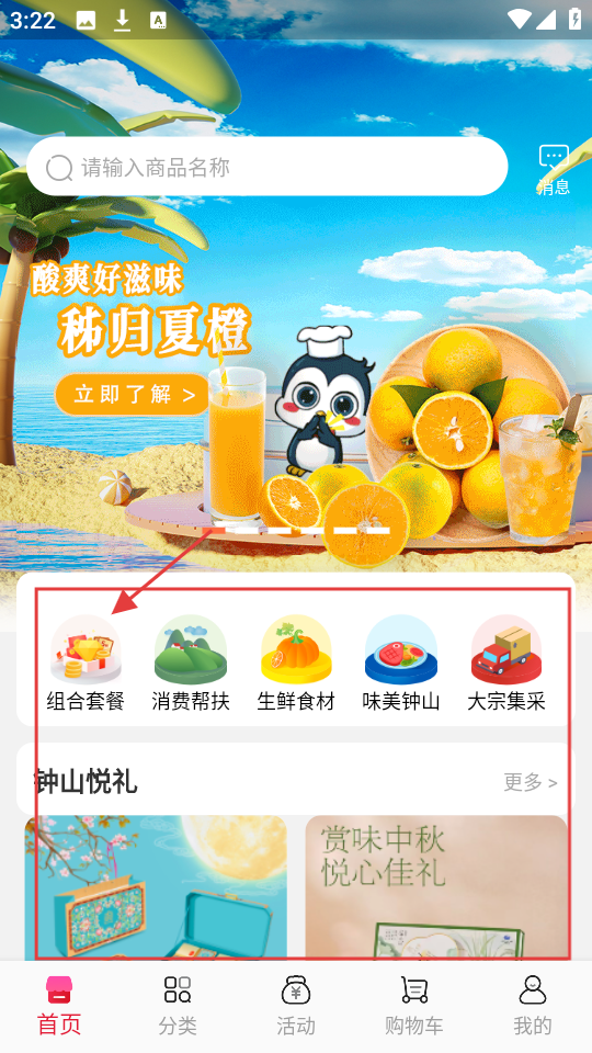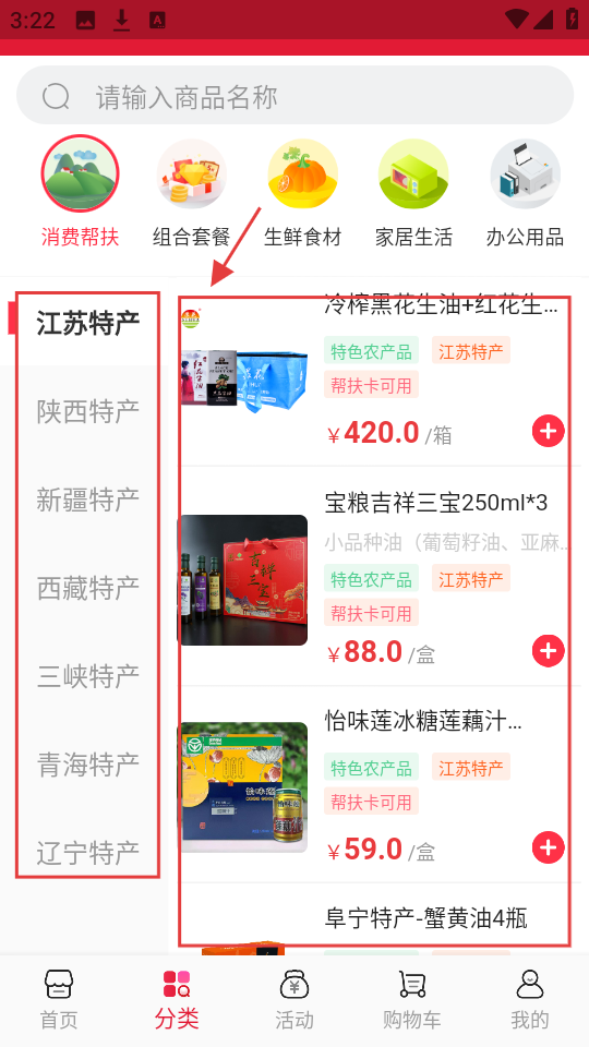 1、想购物先选分类,从【组合套餐】【消费帮扶】等分类里,找要逛的板块。