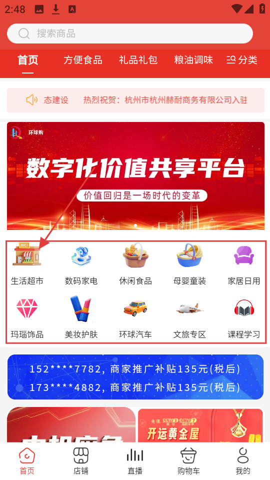 1、想购物先选分类,从【生活超市】【数码家电】等分类里,找要逛的板块。