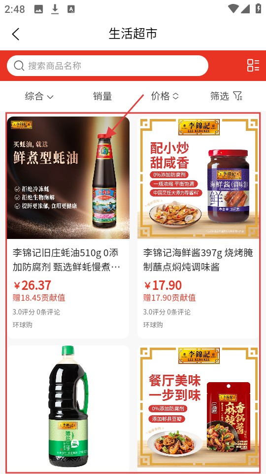 2、进入生活超市后,浏览商品列表,对比价格、评分,挑符合需求的商品。