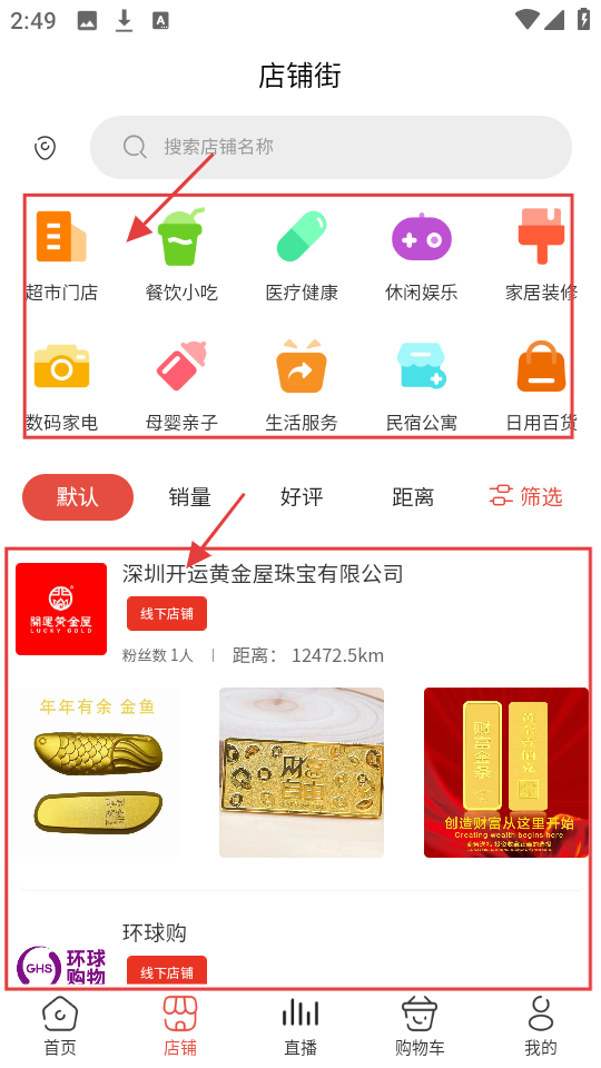 4、若想逛店铺,选【超市门店】【餐饮小吃】等分类,或直接搜店铺名称找心仪店铺。