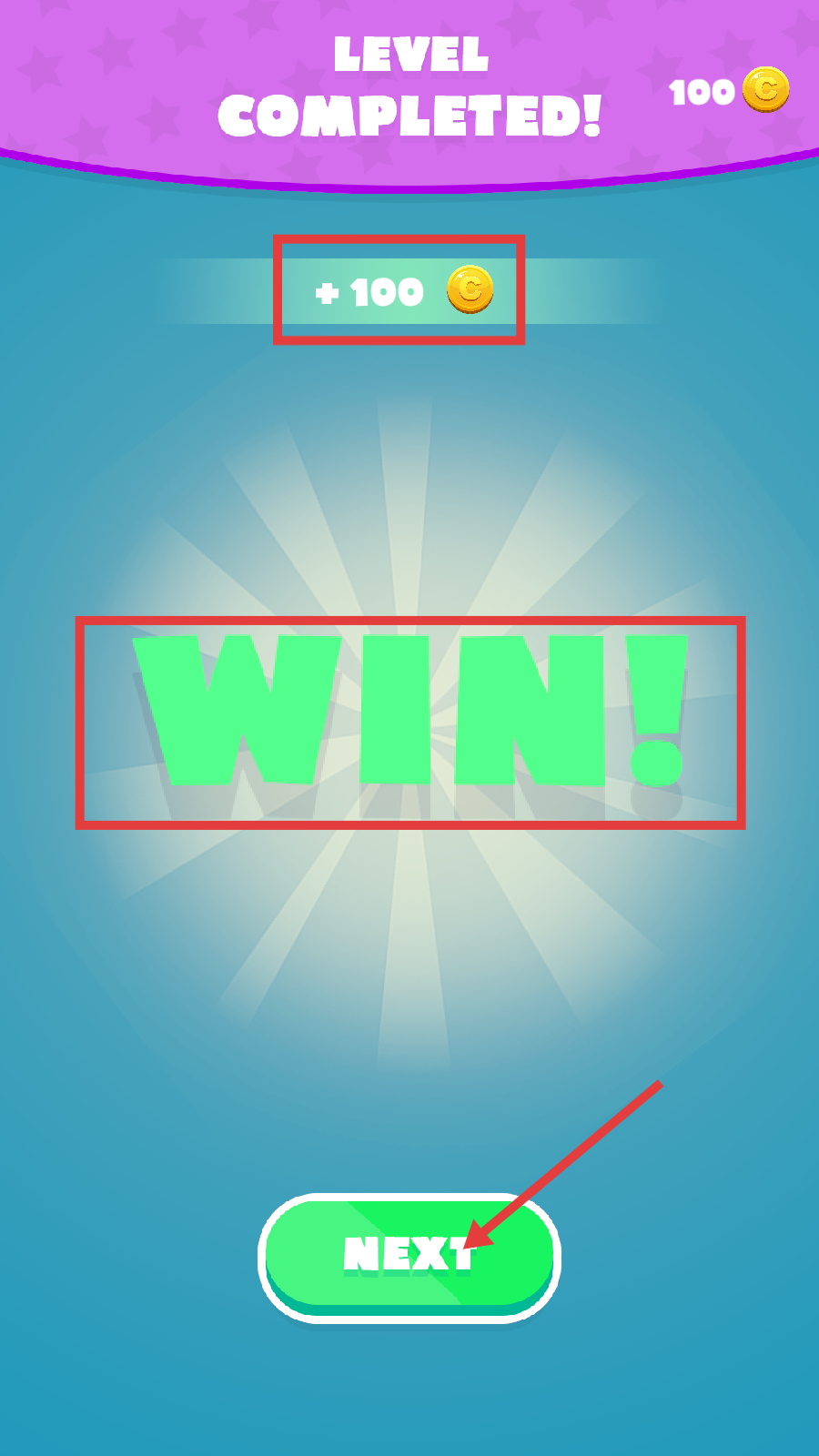 4、成功通关后,界面显示【LEVEL-COMPLETED!】和【WIN!】,获得+100金币奖励,点击【NEXT】进入下一关。