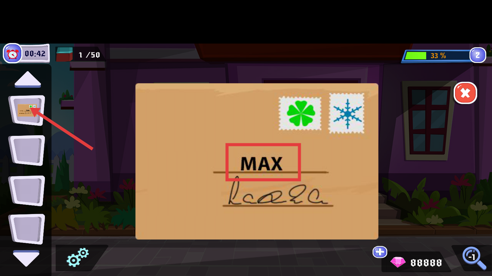 2、进入关卡后,关注左侧邮件图标,根据信封上的【MAX】提示,开展与邮件相关的任务流程。