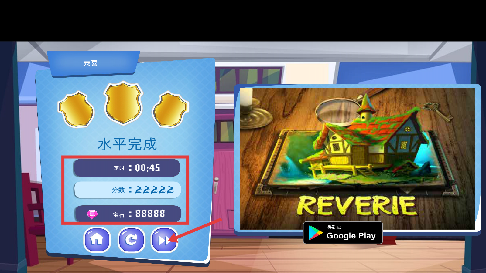4、成功通关后,界面显示【水平完成】,可查看定时、分数、宝石等奖励,点击箭头按钮进入下一关。