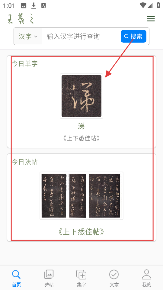 1、进入应用首页,可在搜索框输入汉字查询,还有【今日单字】展示王羲之《上下悉佳帖》中的“涕”字,及【今日法帖】展示该法帖内容。