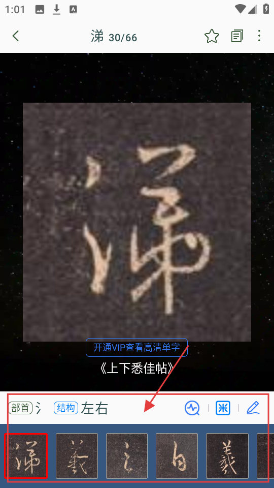2、查看“涕”字详情,能了解其【部首】、【结构】,下方还有同帖中其他字,开通VIP可查看高清单字,助力单字学习。