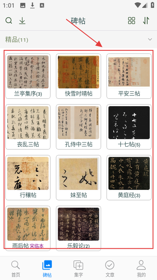 3、进入【碑帖】页面,有《兰亭集序》《快雪时晴帖》等11部精品碑帖,可挑选感兴趣的碑帖,深入研习书法。