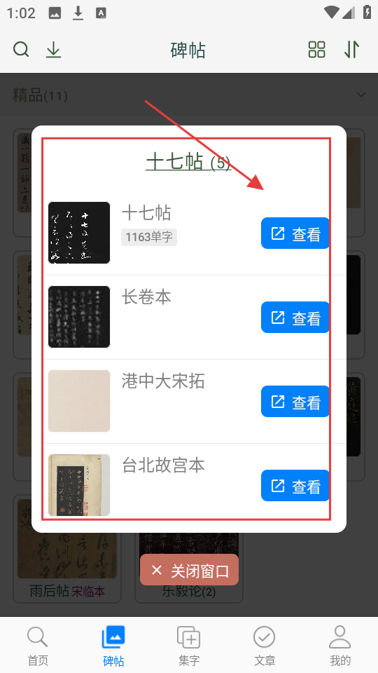 4、点击《十七帖》,会弹出其不同版本,如【长卷本】【港中大宋拓】【台北故宫本】等,点击【查看】可了解各版本内容。