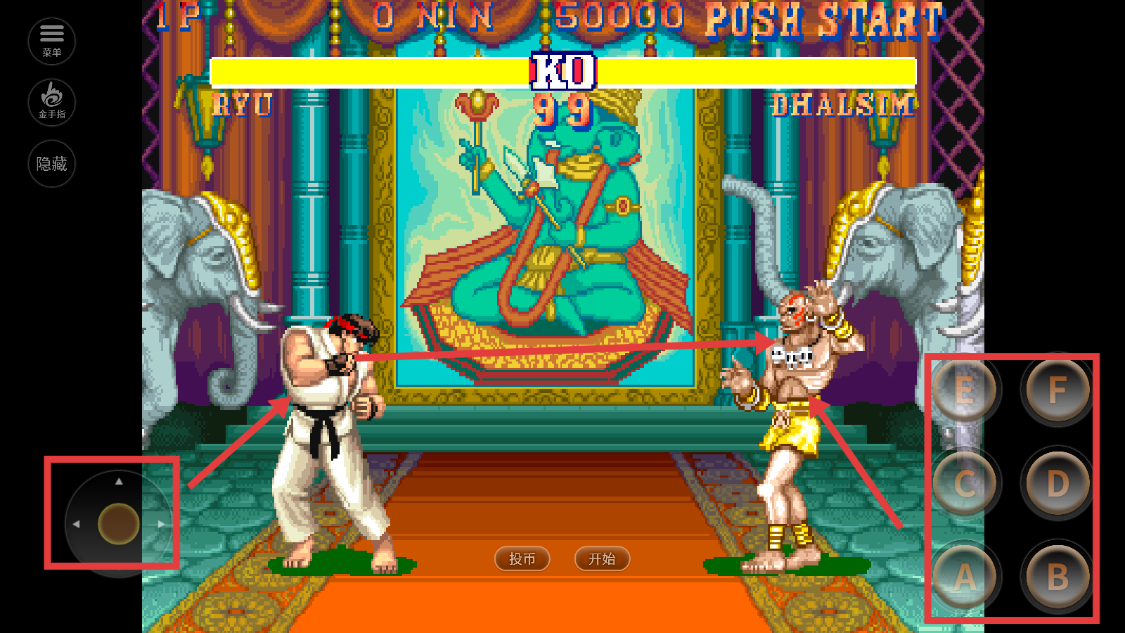 2、对战时用左侧方向键控制角色移动,右侧【A】【B】【C】【D】【E】【F】键释放不同招式,灵活操作应对对手。