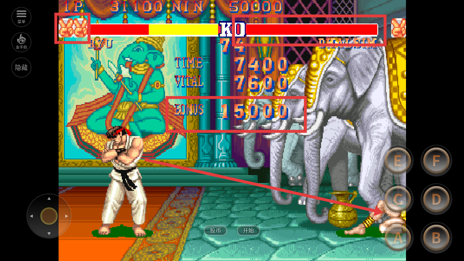 3、关注画面上方的血量条,同时留意【BONUS-15000】这类奖励分数,根据血量和对手状态调整战术。