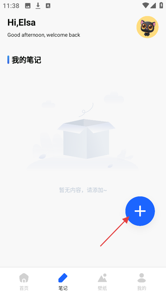 4、进入【笔记】页面,若暂无内容,可点击蓝色【+】按钮添加笔记,记录旅游相关的想法或经历。