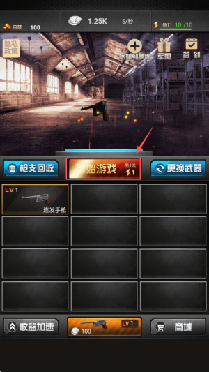 2、如何准备战斗?在主界面查看“第1关”后点击“更换武器”选连发手枪再点“开始游戏”。