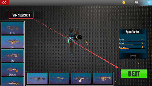 2、如何选择武器?在主菜单点击“GUN SELECTION”,浏览武器后点击“NEXT”确认。