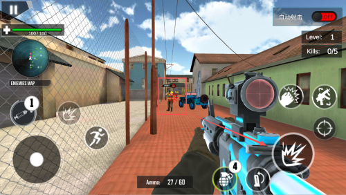 4、如何开始战斗?确认“自动射击”开启,点击“Level: 0/5”即可进入关卡,击杀27/60个敌人即可通关。