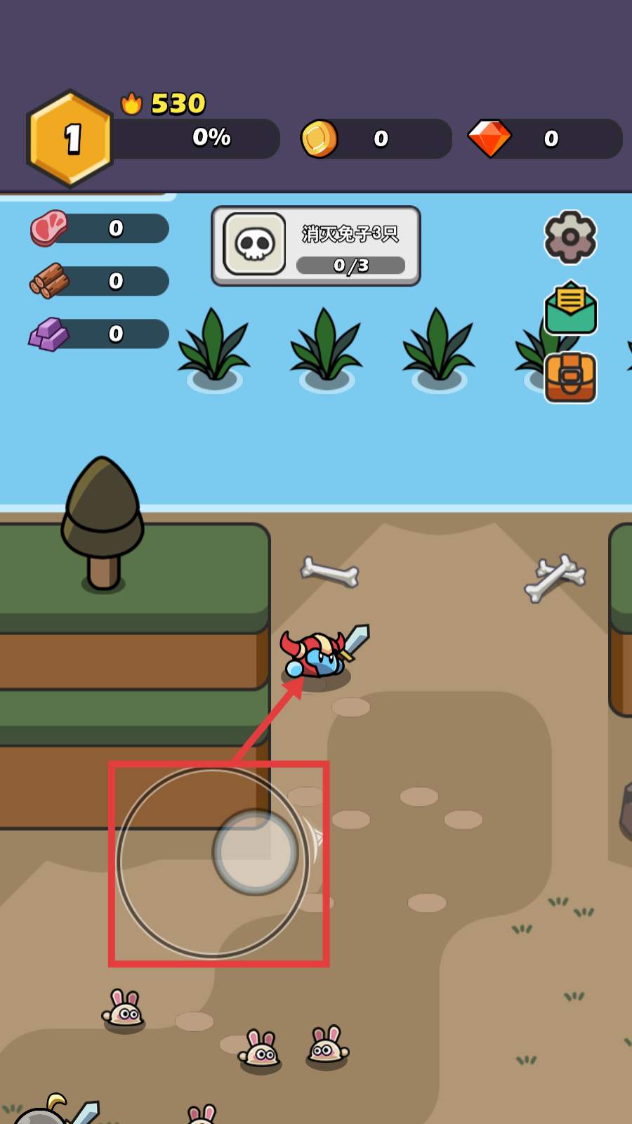 1、进入游戏,操控角色,着手完成【消灭兔子-3只】的任务,借助虚拟摇杆移动角色开启挑战。
