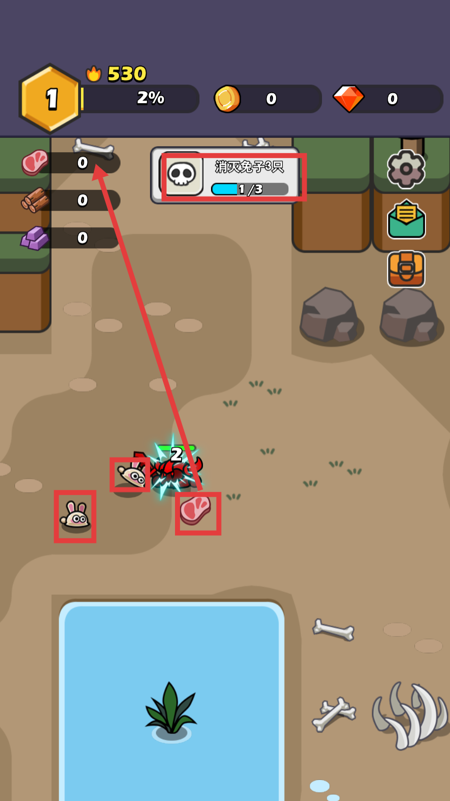 2、消灭兔子过程中,会获取【肉】资源,同时推动【消灭兔子-3只】的任务进度,向目标逐步迈进。