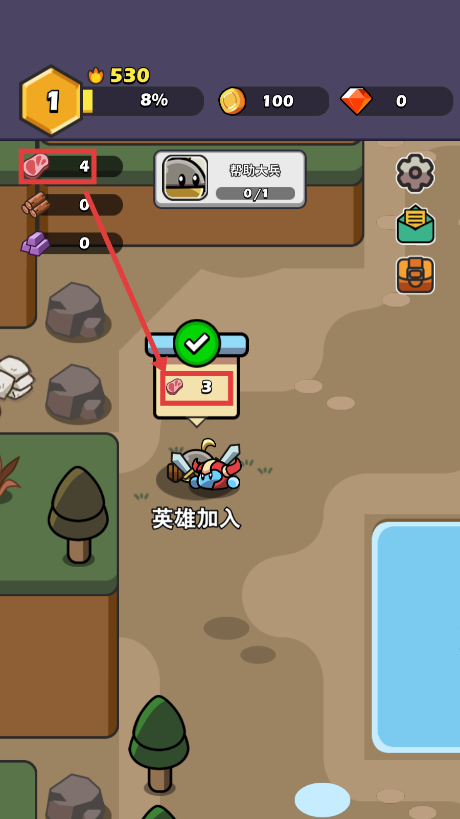 3、积攒足够【肉】资源后,完成【帮助大兵】的任务,即可解锁“英雄加入”,让队伍更强大。