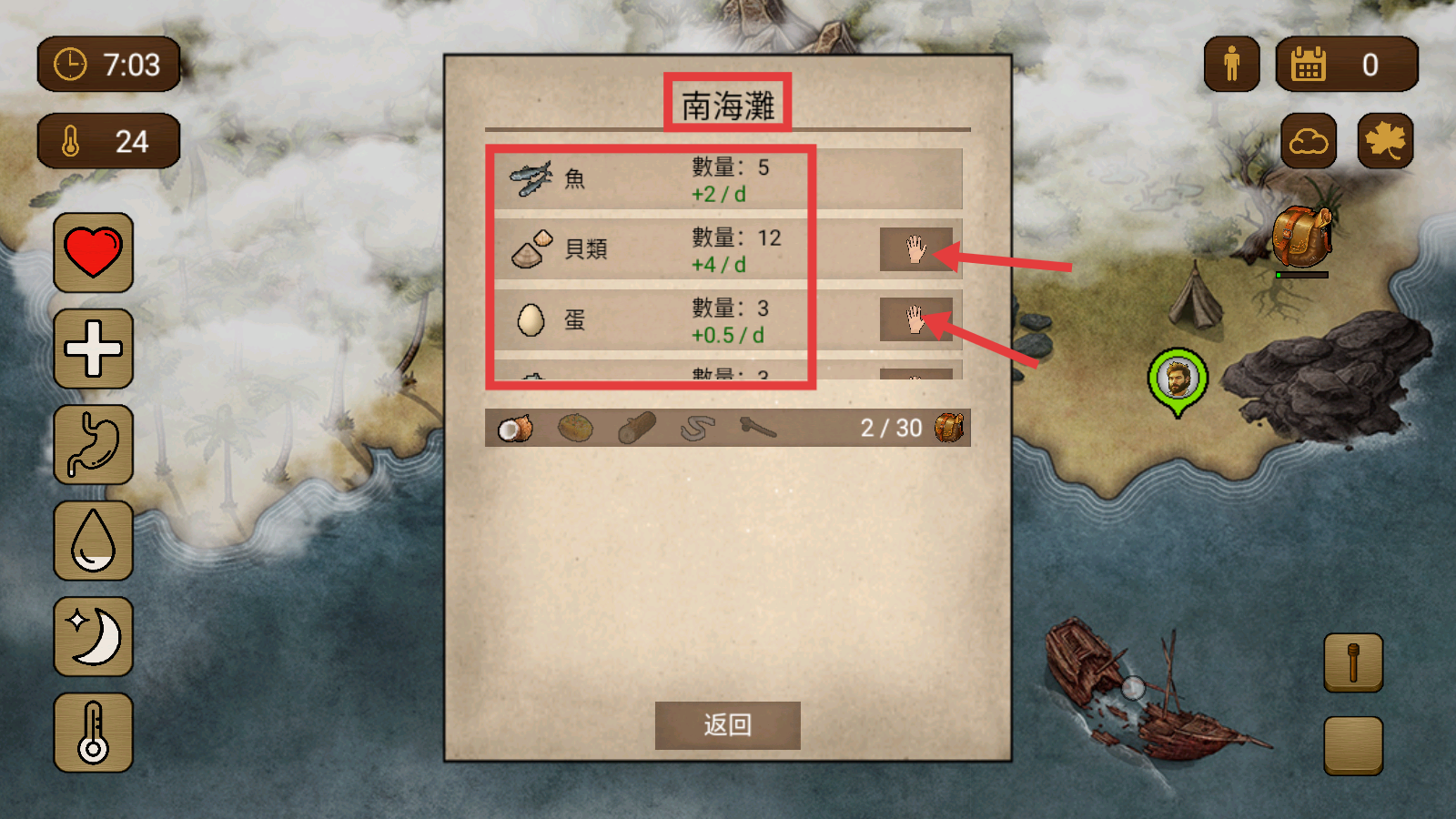 3、前往【南海灘】,收集【魚】【貝類】【蛋】等资源,它们每日会增长,能助力荒岛生存。