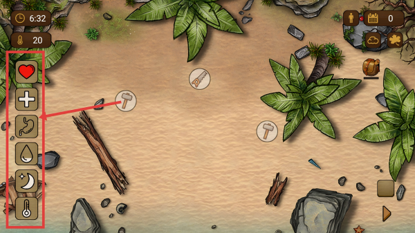 2、冒险中关注左侧【生命】【健康】【飢餓】【水分】等状态图标,借助锤子等工具为生存筹备。