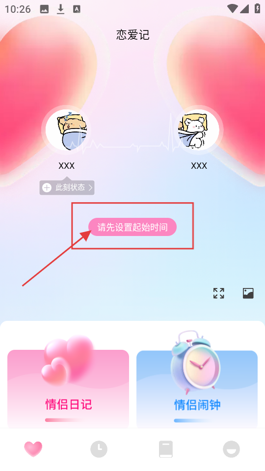 1、使用恋爱记功能,先点【请先设置起始时间】,进入时间设置界面。
