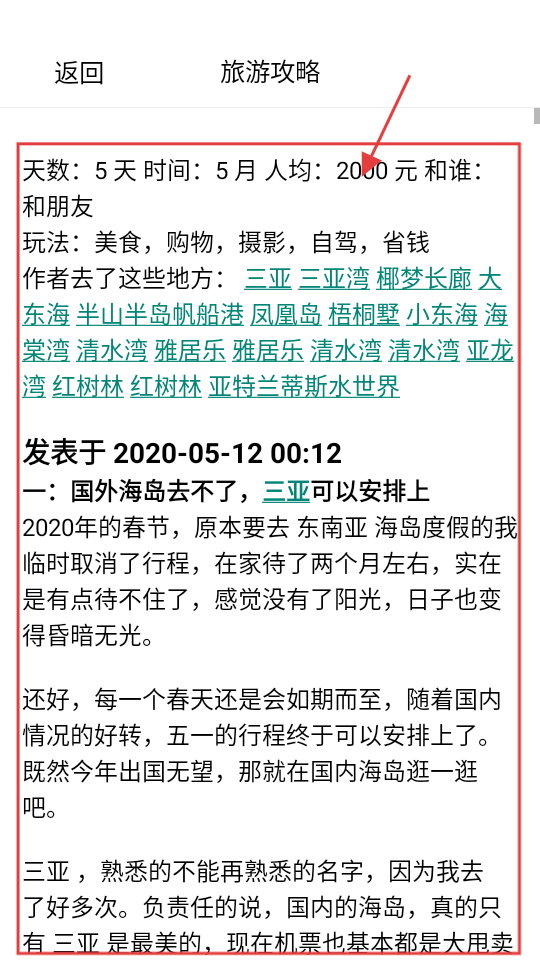 4、选好旅游攻略后,仔细阅读攻略内容,了解天数、人均花费、玩法及景点等信息,为旅游做准备。