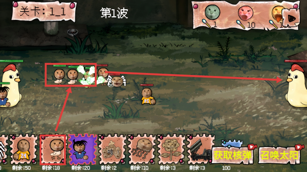3、战斗时选择剩余数量充足的单位,放置到战场中,让其攻击敌方鸡,推进每一波战斗。