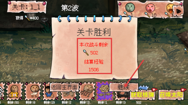 4、关卡胜利后,可获得棉签和结算经验,点击【继续】,进入后续关卡,积累更多资源与经验。