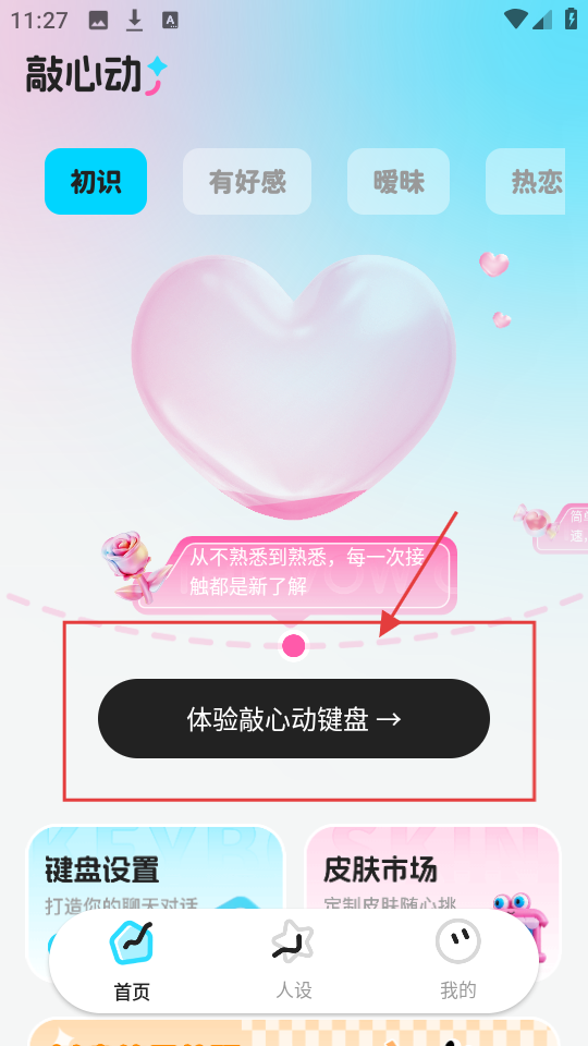 1、在敲心动首页,可先体验【敲心动键盘】,借助它便捷回复,助力追爱,开启互动第一步。