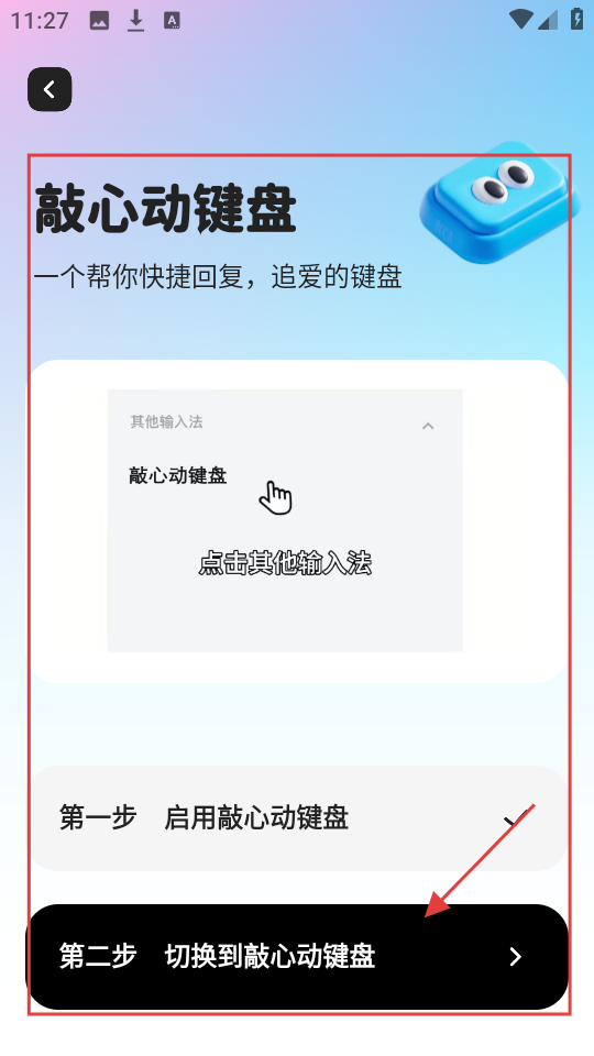 2、进入敲心动键盘页,先启用该键盘,再按提示切换到敲心动键盘,完成键盘设置。