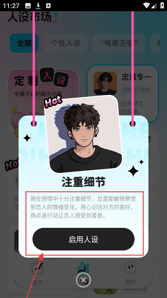 4、选好人设后,比如【注重细节】,查看其人设介绍,若满意,点【启用人设】,使用该人设互动。
