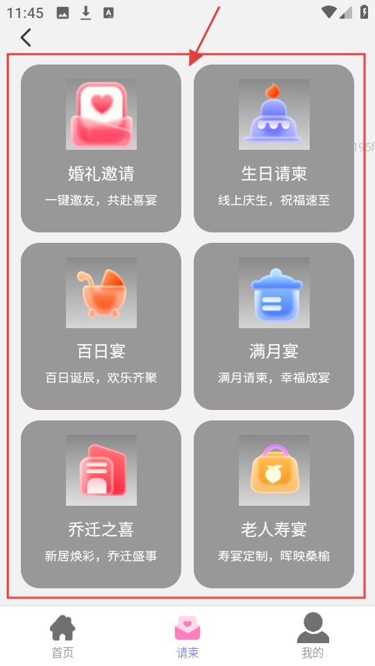 1、在请柬页,有【婚礼邀请】【生日请柬】等多种请柬类型,可根据需求选择对应的请柬。