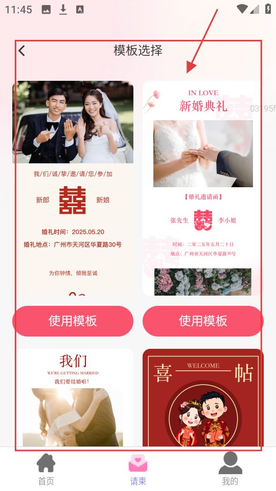 2、选好请柬类型后,进入模板选择页,能看到多款精美模板,挑选喜欢的模板,点【使用模板】。
