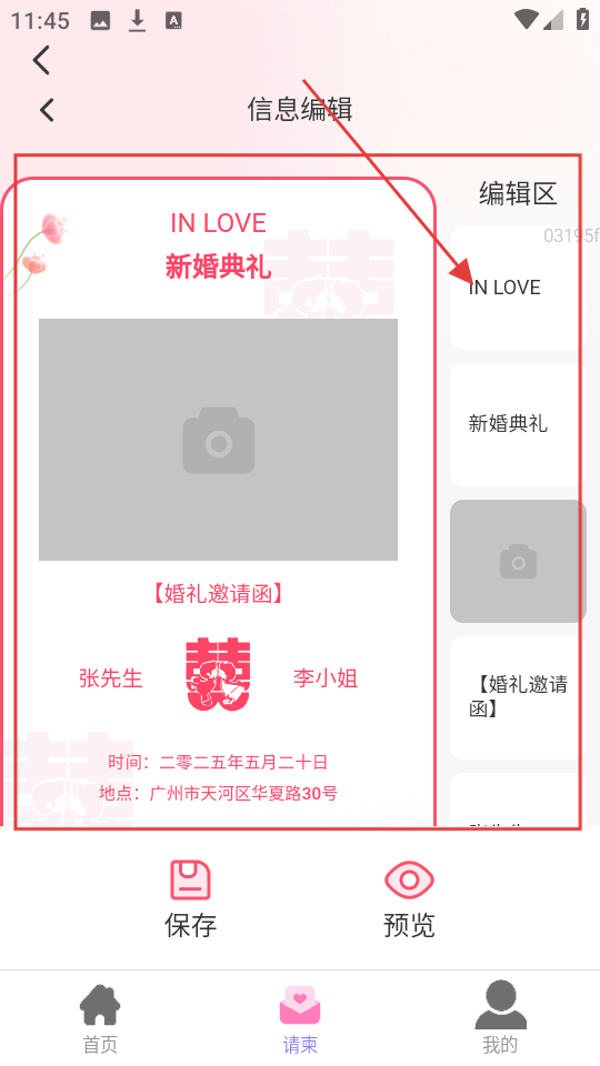 3、进入信息编辑页,可在编辑区修改请柬内容,如文字、图片等,编辑好后可点【保存】或【预览】。