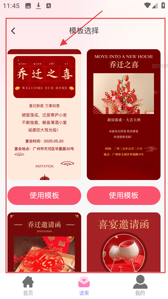 4、若要制作乔迁类请柬,在模板选择页,挑选合适的乔迁请柬模板,点【使用模板】,再去编辑信息。