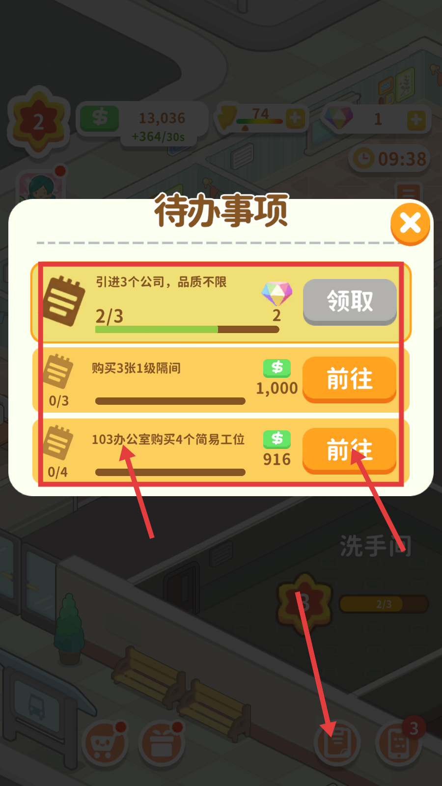 1、查看【待办事项】,推进【引进3个公司-品质不限】【购买3张1级隔间】【103办公室购买4个简易工位】的任务,按提示操作。