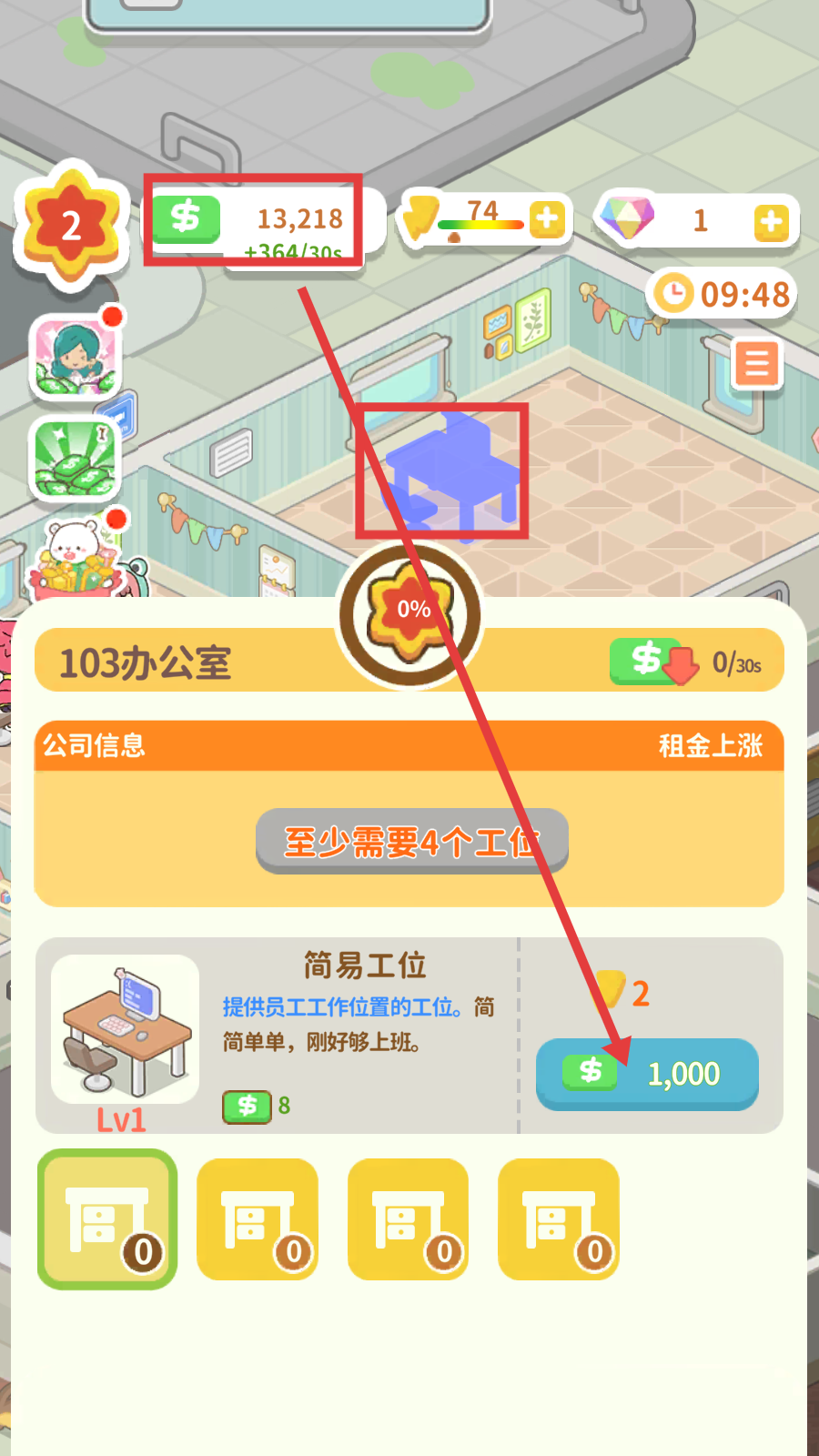 2、前往【103办公室】,花费【$1000】购买【简易工位】,满足至少4个工位的需求,推进办公室布置。