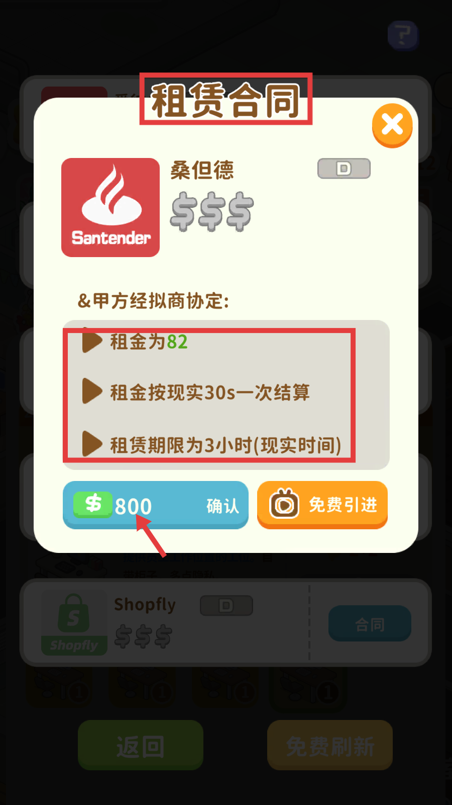 3、签订【租赁合同】,与【桑坦德-Santander】达成协定,花费【$800】确认引进,租金82、30秒结算一次、租期3小时(现实时间)。