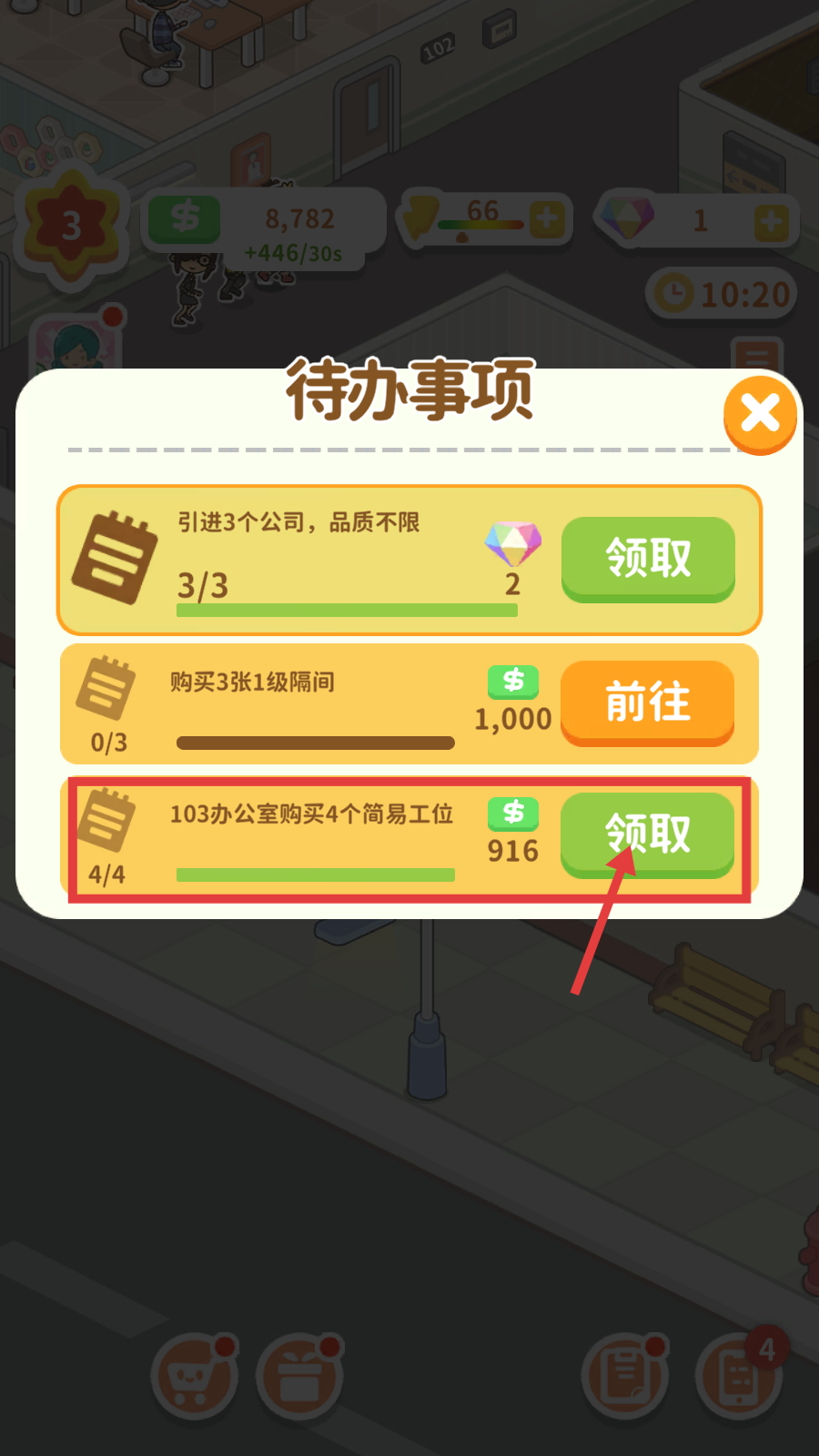 4、【待办事项】中【引进3个公司-品质不限】【103办公室购买4个简易工位】任务完成,点击【领取】,获取对应的奖励。