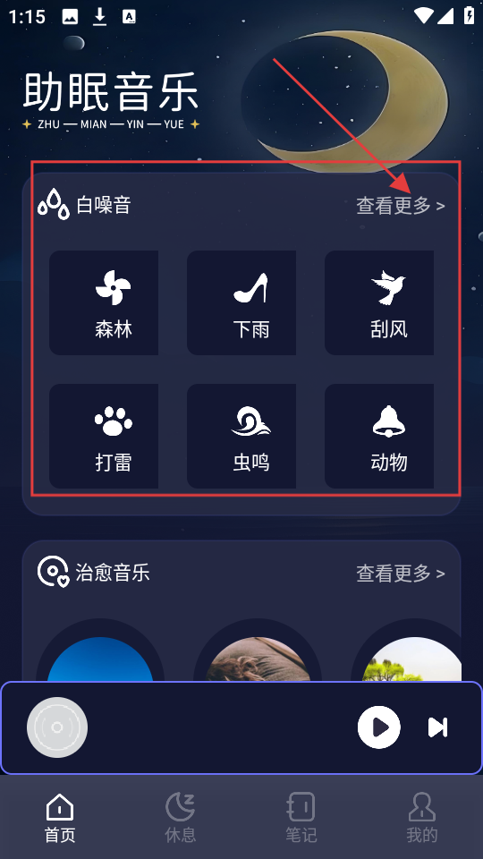 2、在助眠音乐页,白噪音分类里有【森林】【下雨】等,若想更多,点【查看更多】找喜欢的白噪音。