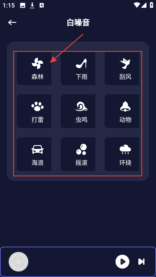 1、在白噪音页,有【森林】【下雨】【刮风】等多种白噪音,可根据喜好选择,营造舒适听觉环境。