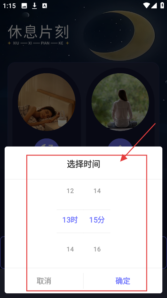 4、在选择时间弹窗,可设置休息的时分,选好13时15分这类时间后,点【确定】,完成时间设置。