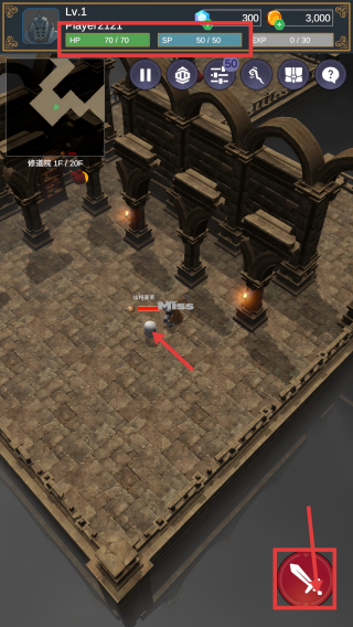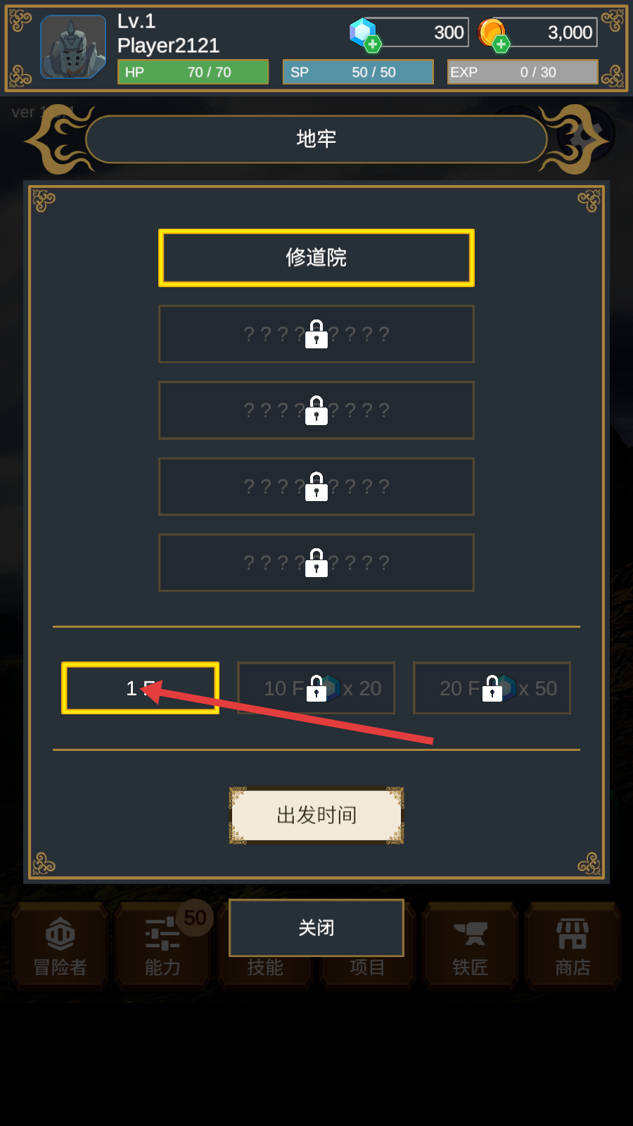 1、进入地牢界面,选【修道院】区域,点击【1F】可开始初级探索,先熟悉低层地牢机制。