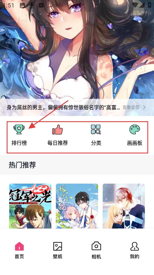 1、在首页,有【排行榜】【每日推荐】等功能,点【排行榜】可看热门内容,也能从分类找喜欢的,还能去画画板创作。