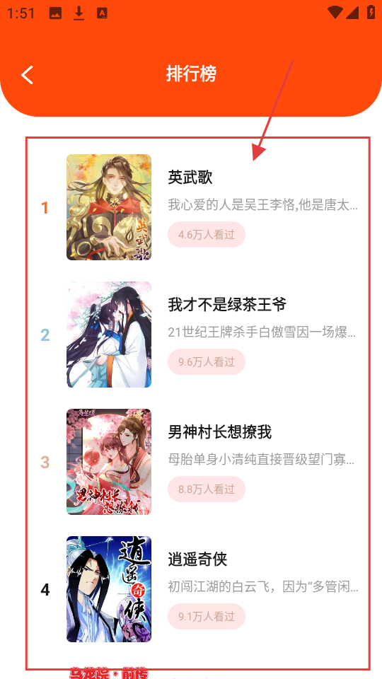 2、进入排行榜页,能看到《英武歌》《我才不是绿茶王爷》等热门作品,选感兴趣的作品点击进入查看详情。