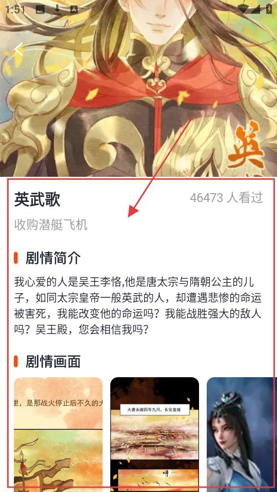 3、进入《英武歌》详情页,可看剧情简介,了解故事背景,还能欣赏剧情画面,感受作品的画面风格。
