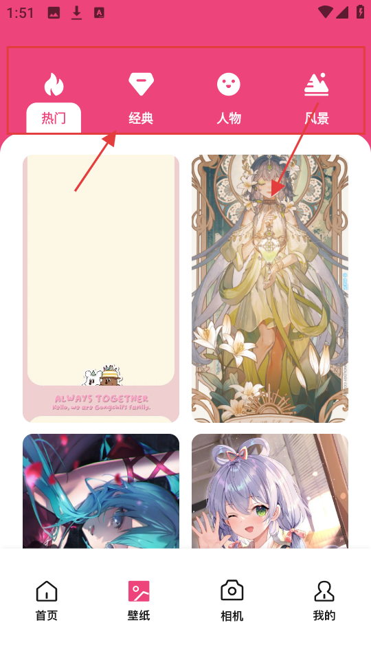 4、在壁纸页,有【热门】、【经典】等分类,选经典分类,里面有各类精美壁纸,挑喜欢的壁纸使用或收藏。