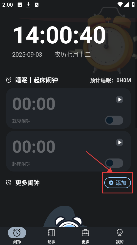 1、在闹钟页,能设置就寝和起床闹钟,若需更多,点【添加】,可新增闹钟,管理时间更灵活。