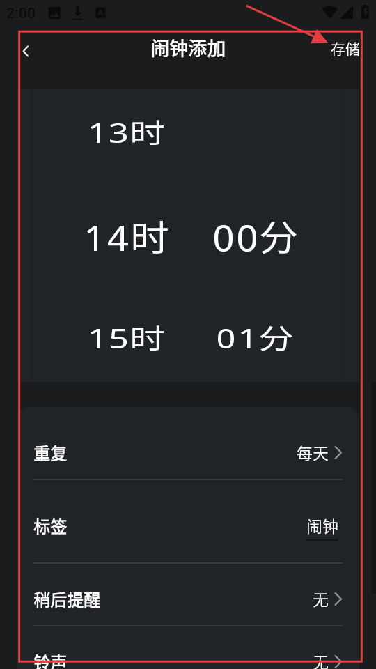 2、进入闹钟添加页,设置时分,还能设重复、标签等,都选好后点【存储】,完成新闹钟设置。