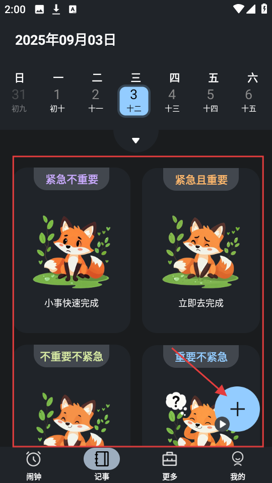 3、在记事页,有不同重要程度的分类,点【+】号,可添加新的待办事项,规划每日要做的事。